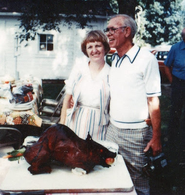 The Riley family held a family reunion on September 1979 in Kansas City at Dr. Lou and Deloris Allen's house. Food on the menu was roast pig. Standing in back, from left; Glen Riley, Ada Mae Hubbard, Don Riley. Standing in front, from left; Deloris Allen, Monzella Waddington, Naomi Riley Massey, Ramona Sparwasser: